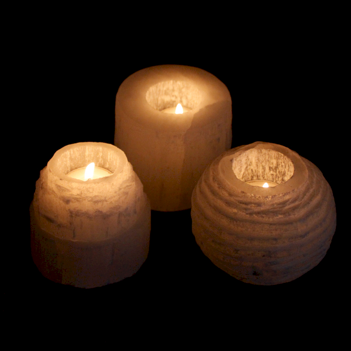 Selenite Candle Holders are shiny and sometimes with whiter areas. Top of each candle holder is polished and the underside is cut flat.